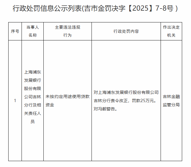 Pudong Development Bank Jilin分支机构因违反法规而被罚款,并且没有用于商定目的的贷款资金。